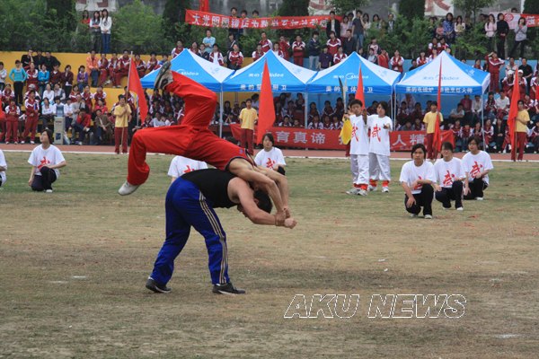 冲天的锣鼓奏响梦想,红色的绸缎舞动青春。学院腰鼓队用青春与梦想编织的舞蹈拉开了文艺演出的序幕;健美操表演以自信与激情跳出了生命的绚丽;院武术协会的表演充分诠释了中华武术“刚健有为,自强不息”的精神;中文系100名男生带来的舞蹈将整场演出推向高潮。精彩的文艺演出过后,杨涛宣布我院第三十一届春季田径运动会正式开幕。