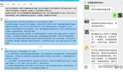 电气和机械基础教研室分别以微信群和QQ群的形式召开了研讨会,老师们对线上教学谈了自己的认识和经验,也对线下如何跟进进行了了讨论。张翠英副教授在研讨会上分享了自己的经验:“提前两天通过雨课堂群发公告和QQ课程群同时发布线上教学内容的课前、课中、课后任务书。课上主要针对本次教学任务的重难点进行讲解,鼓励学生利用【投稿】功能具体描述不懂的内容。就每次课的知识点发送几道选择题,限时时间1-2分钟不等。课后通过与学生QQ分享屏幕的教学方式讲解学生不懂的知识点,同时把腾讯课堂作为雨课堂的辅助。”