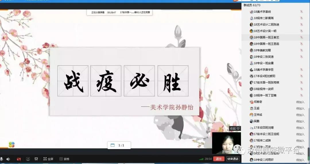 2020年3月19日晚七点,美术学院师生联合党支部开展了一次特殊的党课。本次党课由师生联合党支部书记曾凡超老师主持,组织委员孙静怡老师为全体2019年新发展的积极分子线上讲授。67名入党积极分子在家通过直播参与此次培训,战“疫”期间的“云”党课,对这些积极向党组织靠拢的青年学子们意义非凡。