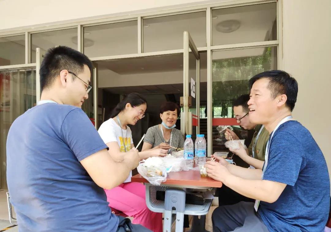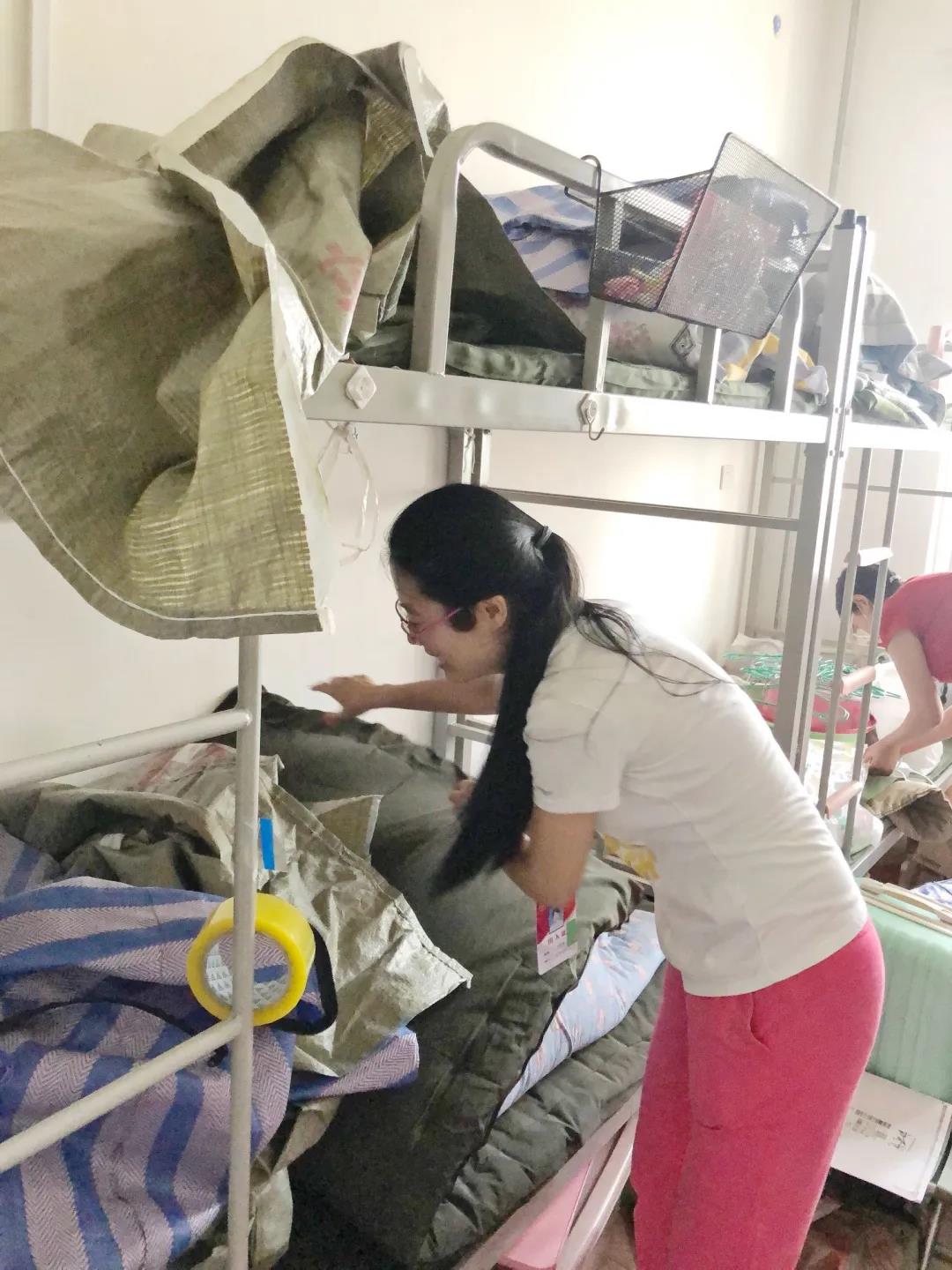 中午时分,老师们在宿舍楼门口的桌前午餐,有的老师为了赶时间用热水泡面,在简单的午餐后也顾不上休息,又投入到宿舍整理工作当中。