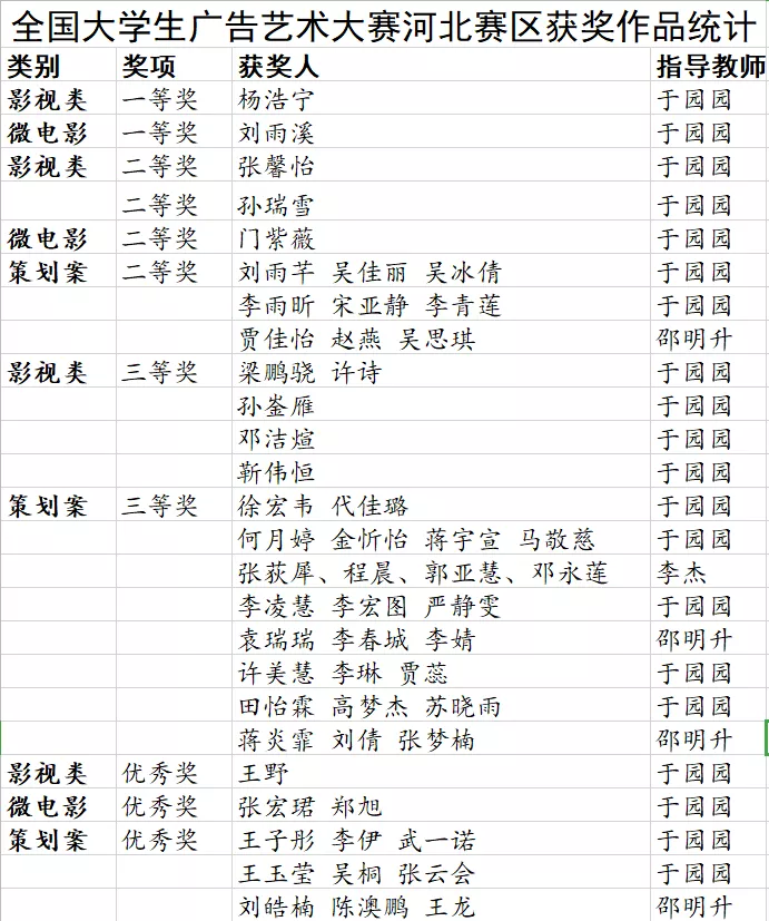 全国大学生广告艺术大赛是由教育部高等教育司指导、教育部高等学校新闻传播学类专业教学指导委员会、中国高等教育学会广告教育专业委员会共同主办,中国传媒大学、全国大学生广告艺术大赛组委会承办的全国高校文科大赛,是迄今为止全国规模最大、覆盖高等院校较广、参与师生人数多、国家级大学生赛事,至今已成功举办十一届。本次比赛河北赛区有包括河北大学、燕山大学、河北师范大学、华北电力大学等在内的几十余所高校参赛。