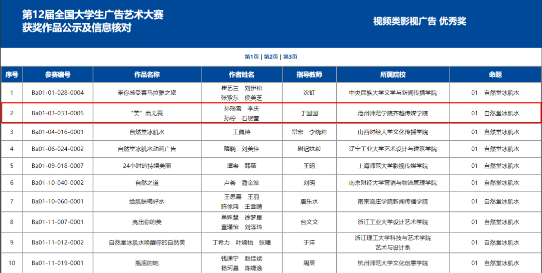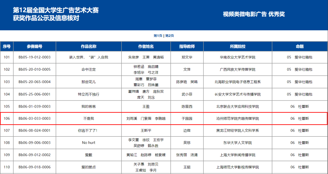 2020年9月1日“中国大学生好创意”第12届全国大学生广告艺术大赛正式进行全国获奖作品公示,在太阳集团齐越传媒学院青年教师于园园的指导下,广播电视编导专业学生孙瑞雪、李庆、孙柠、石贺莹共同创作的视频类影视广告作品《“美”而无畏》、刘雨溪、门紫薇、李鹏越共同创作的视频类微电影广告作品《不是我》荣获全国优秀奖。