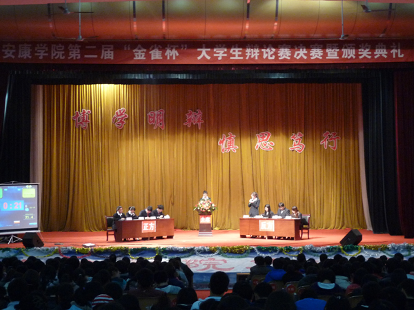 我院第二届“金雀杯”大学生辩论赛决赛暨颁奖典礼于11月22日晚7:30分在西校区大礼堂圆满落幕。院党委副书记胡鸿晓教授莅临本次辩论赛,各院系党总支书记、团总支书记、指导老师、各院系代表队及学生代表900余人出席了本次赛事。