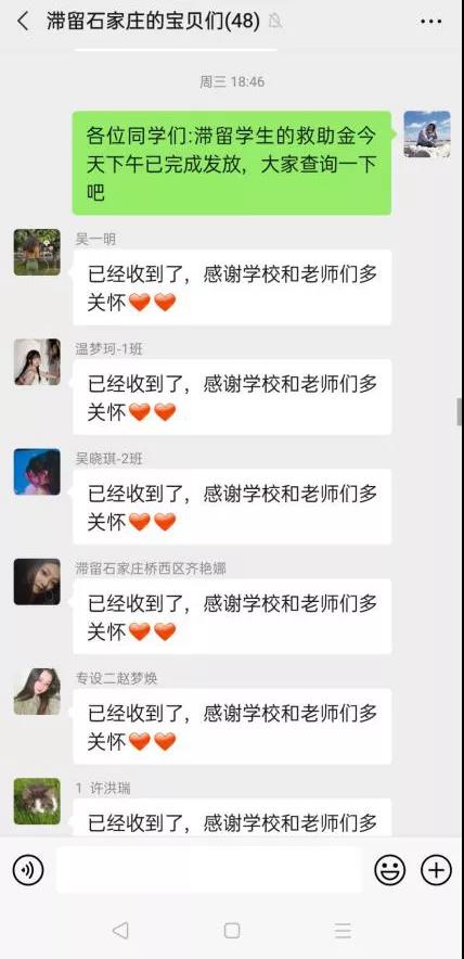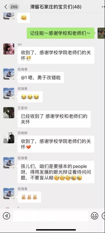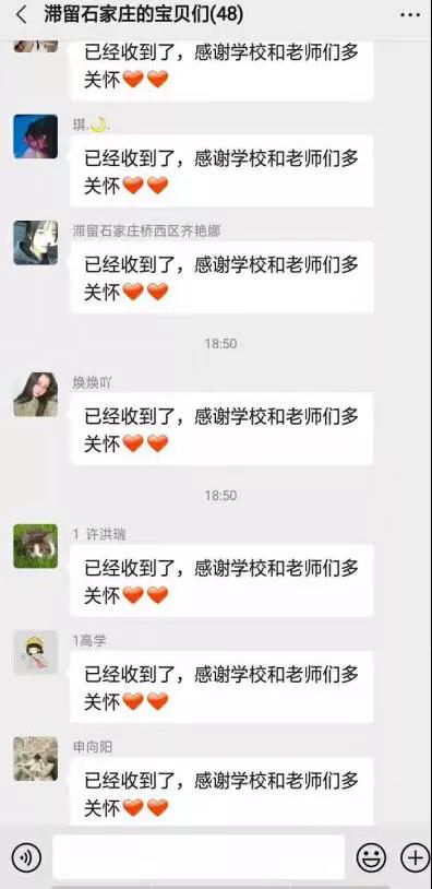 最后,我再次代表滞留在石家庄的同学们,衷心地感谢学校领导和老师们对我们的关怀和帮助!真心祝愿学院年年桃李,岁岁芬芳!领导老师们身体健康,事事顺意!