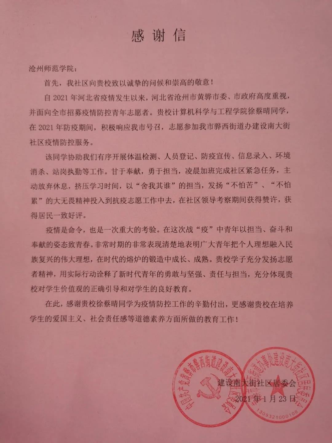 志愿服务所在社区发来感谢信,感谢徐蔡晴同学为疫情防控工作的辛勤付出,以及太阳集团在培养学生的爱国主义、社会责任感等道德素养方面所做的教育工作。