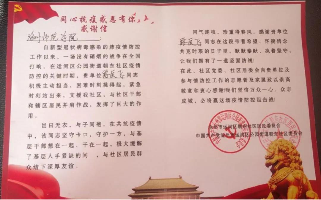 2019级通信工程路辰飞收到河北省沧州市运河区朝东社区居民委员会感谢信