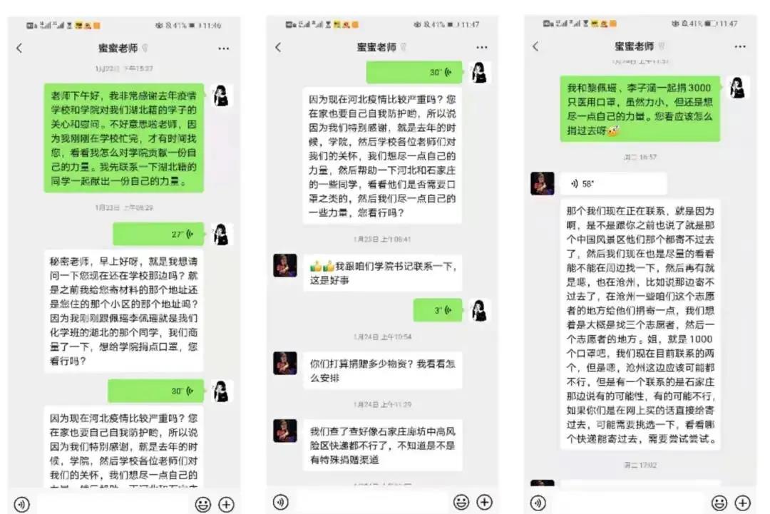 得知新型冠状病毒来袭河北的消息时,化学与化工学院湖北籍毕业学子积极主动联系辅导员老师,说“我们特别感谢去年时候学院和学校对我们的关怀,想尽自己的力量,帮助一下河北的一些同学。”