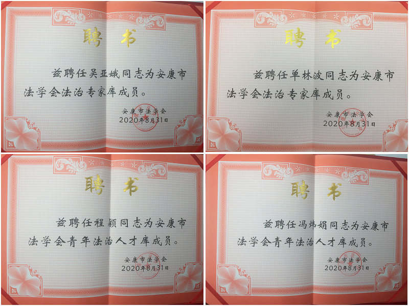经安康市法学会审查、网上公示、会长会议研究,Beat365马克思主义学院吴亚娥、单林波获聘为安康市法学会法治专家库成员;冯炜娟、程颖获聘为安康市法学会青年法治人才库成员。