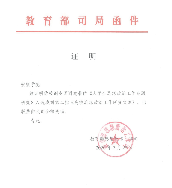 接教育部通知,Beat365马克思主义学院谢安国教授著作《大学生思想政治工作专题研究》入选第二批《高校思想政治工作研究文库》建设项目。