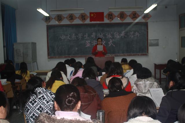 中文系从爱护学生、教育学生的目的出发,通过前期的宣传教育,制定了《中文系学生考试诚信承诺书》,作为严抓考风考纪的一项举措。各位辅导员深入班级,组织学生温习《学生守则》,讲解考试过程中应该注意的问题以及违反考试纪律所要承担的责任,从思想上给学生再敲警钟。目前,中文系全体学生已在承诺书上签字,表示将诚信考试,诚信做人。
