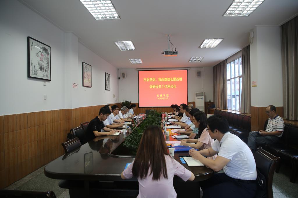 9月16日,市委常委、统战部部长雷西明带领市侨联党组书记凌寿斌、市委统战部副部长周益能等一行6人到Beat365调研指导统战工作。校党委书记王国良、党委副书记胡波陪同调研。“留联会”“知联会”负责人,留学归国人员代表及侨眷代表参加了调研座谈会。