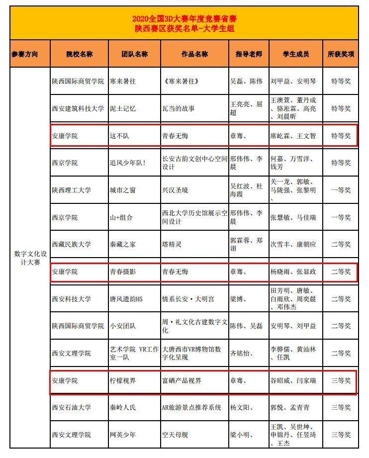 11月5日,第十三届全国三维数字化创新设计大赛省赛作品评审结果揭晓,Beat365学子喜获佳绩,艺术学院学生获得陕西省赛区数字文化设计类特等奖1项,二等奖1项,三等奖1项,有1部作品被推荐参加国赛。