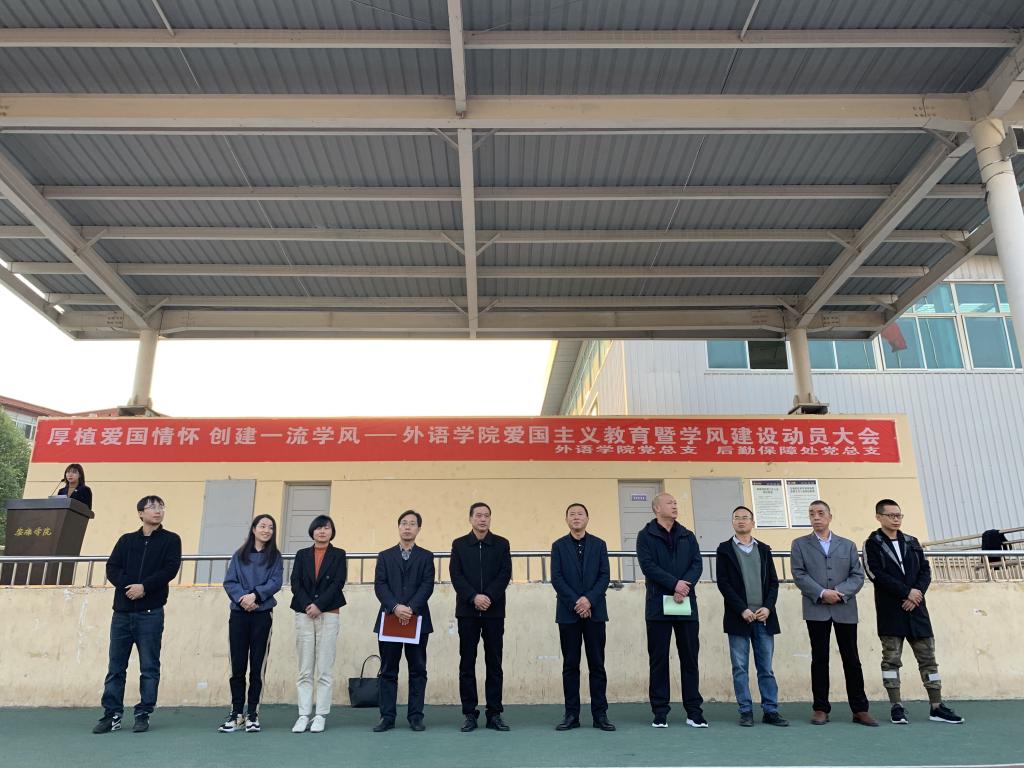 为全面贯彻落实学校学风建设推进会议精神,充分发挥直属党支部和二级学院党总支“结对共建”作用,深入推进“党建+X”和“五联五做”工作模式,外语学院党总支和后勤保障处党总支以“厚植爱国情怀 创建一流学风”为主题,于11月14日下午在江南校区操场召开外语学院爱国主义教育暨学风建设动员大会,在学生中深入开展爱国主义教育,共同助力外语学院创建一流学风。校党委副书记胡波出席大会并讲话。学工部、后勤保障处党总支相关负责同志,外语学院领导班子、党支部书记、系主任、两办主任、辅导员和全院师生参加了会议。会议由外语学院党总支书记肖红香主持。