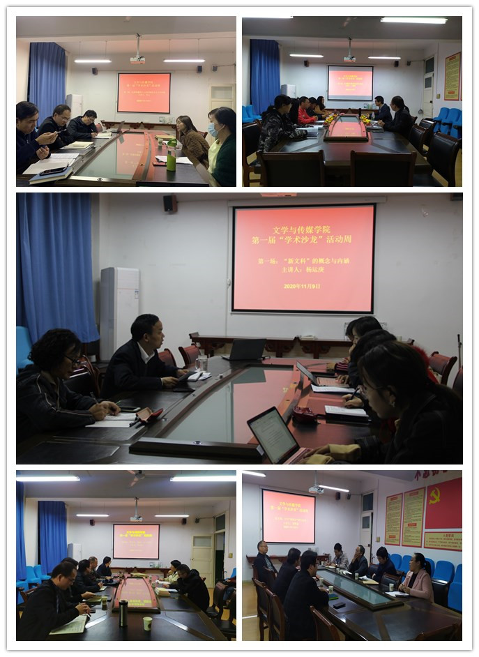 本届“学术沙龙”活动周设置了语言学、文学理论与外国文学、中国古代文学、中国现当代文学、新闻传媒学5个学科方向,先后举办了“‘新文科’的概念与内涵”“社交媒体中隐私的边界与管理”“法国和俄国十九世纪现实主义文学比较”“贾平凹·陕西·乡土中国”“百年‘颂体诗’研究综述”5场“学术沙龙”研讨会。活动中,与会教师分别就相关专业问题各抒己见、侃侃而谈,进行了友好而热烈的学术探讨。
