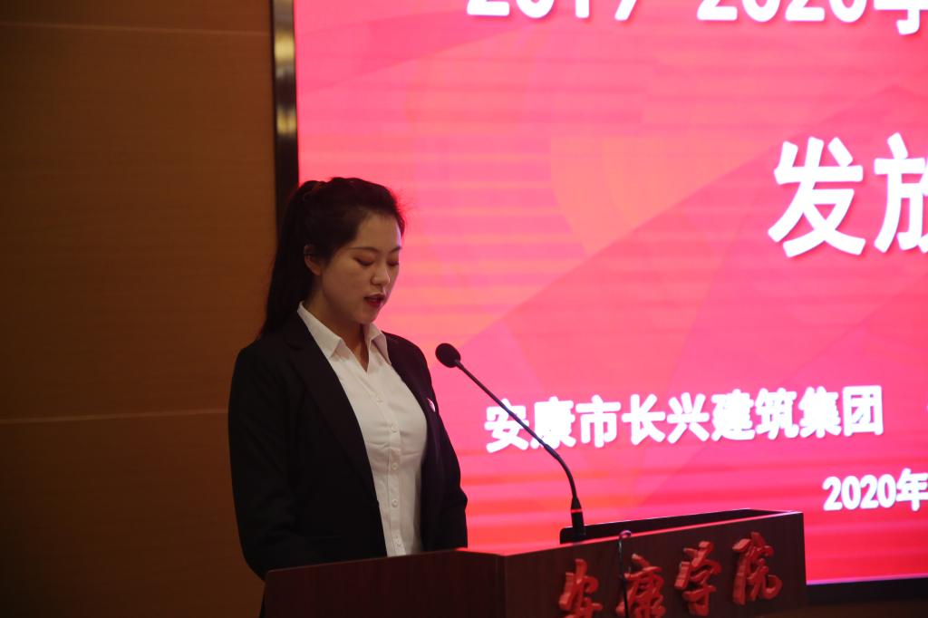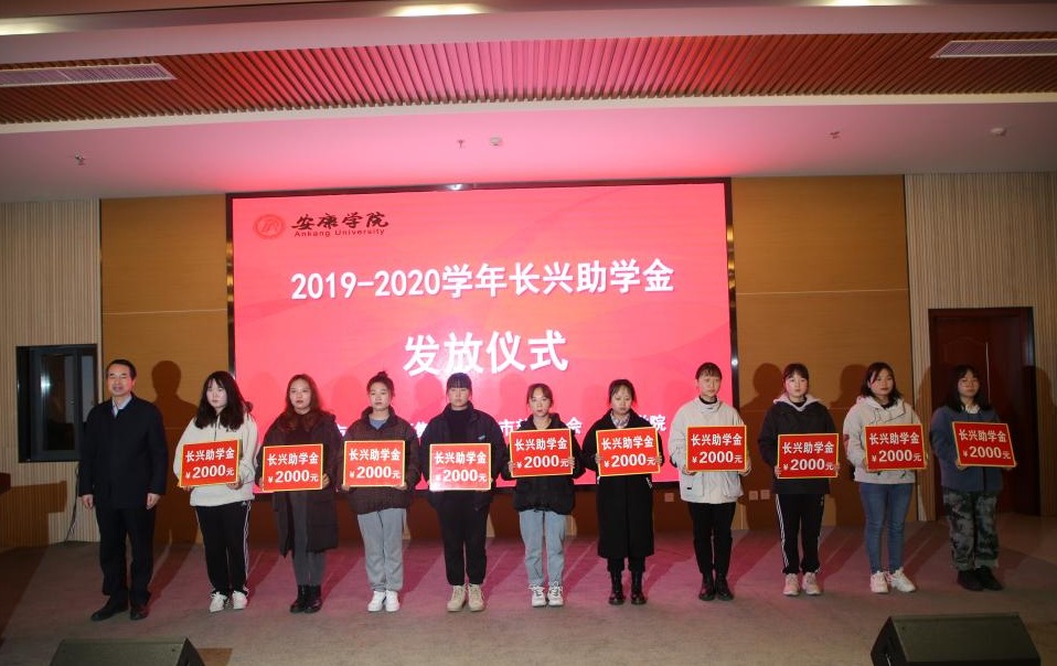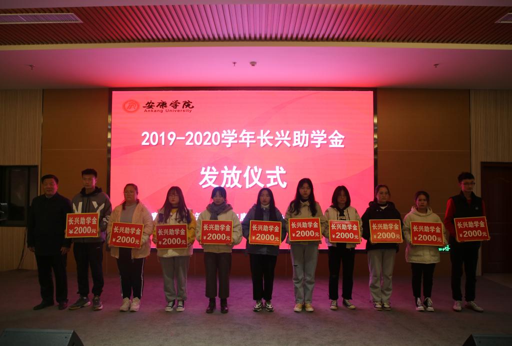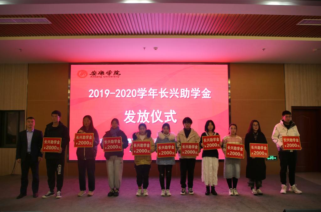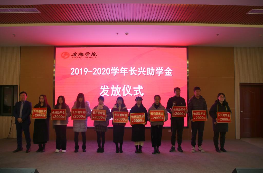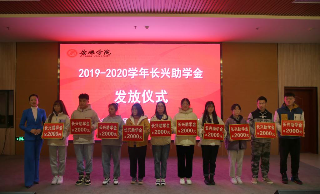 学工部副部长黄娟宣读《Beat365唯一官方网站关于2019-2020年安康市长兴建筑集团助学金评定结果的通知》。与会领导为受助学生发放助学金。