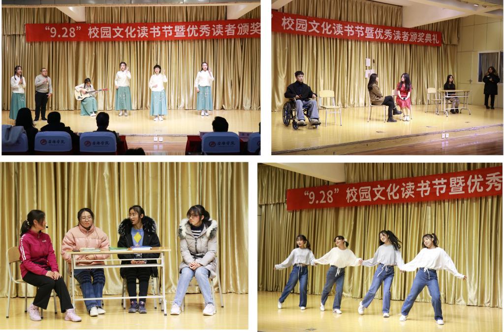 由阅芽读书会和大学生读者协会学生自编自导自演的11个反映校园文化的文艺节目,深受在场师生的一致好评。特邀的安康汉调二黄群艺剧社表演了折子戏《落花园》选段,优美的唱腔和扮相展现了非物质文化遗产独特的艺术魅力。