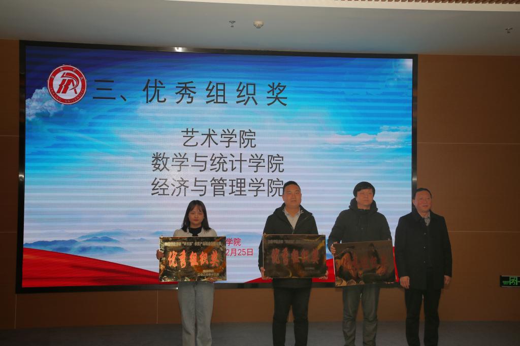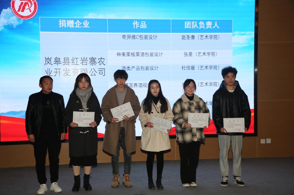 颁奖典礼上,体育学院张一凡《歌风春燕茶叶》、艺术学院金杉虹《吃货联盟-志根豆干包装设计》获得创新创意赛道包装设计类一等奖,艺术学院徐一峰《白河木瓜酒巴山-视频广告》获得创新创意赛道视频广告类一等奖,数统学院彭嘉伟《山中藏美酒,腊肉忆乡愁》获得创业实践赛道一等奖,艺术学院、数统学院、经管学院获得优秀组织奖。与会嘉宾向各获奖团队颁发证书。同时,Beat365向帮扶企业捐赠了15件优秀设计作品,充分体现了Beat365当代青年的责任与担当,展现了Beat365服务“三农”、服务区域经济社会发展的办学方向。