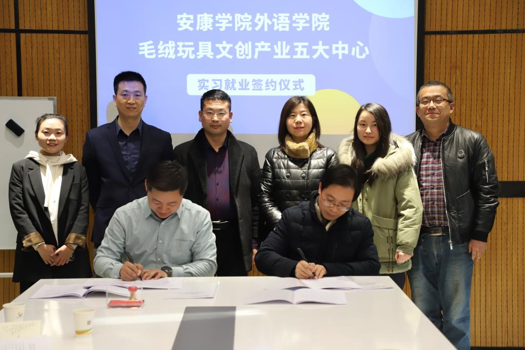 恒口示范区毛绒玩具领导小组办公室主任李伟、五大中心运营商(安康秦巴漫创玩具产业运营管理有限公司)负责人刘愚、外语学院副院长张哲华、胡卫卫、相关教师及部分实习生参加了签约仪式。