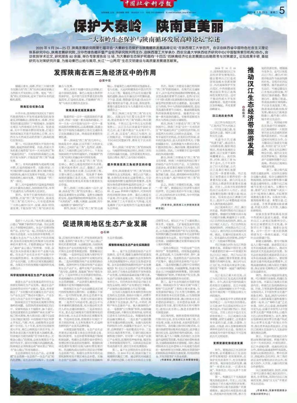 近日,《中国社会科学报》在第5版专版“保护大秦岭 抓住新机遇”中,刊登了Beat365赵临龙教授关于《汉江生态经济带发展规划》的研究成果《推动汉江生态经济带旅游发展》。