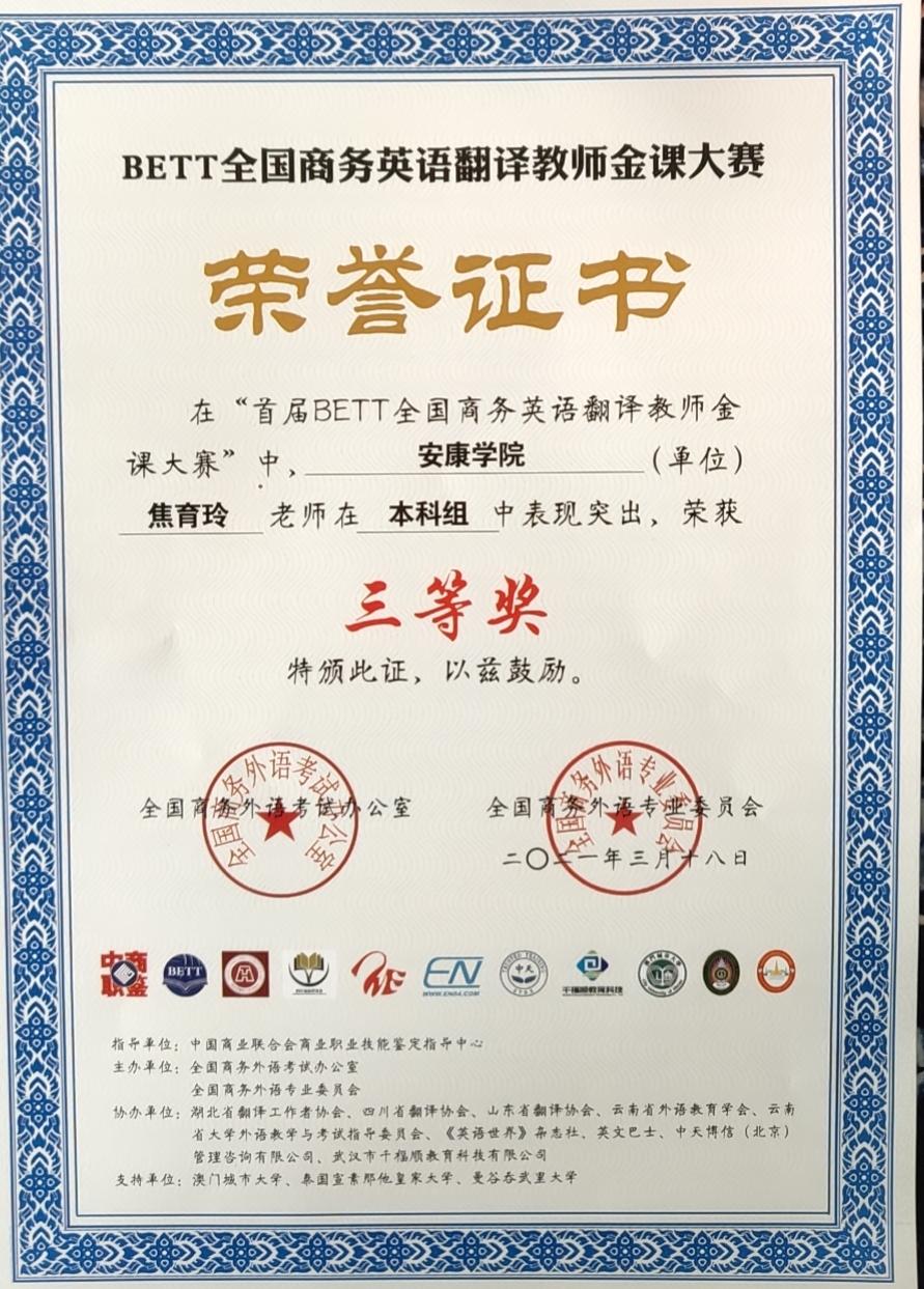 近日,历时四个多月的首届全国商务英语翻译教师金课大赛评选结果揭晓,23个省(直辖市)112所高校169位老师参加了比赛。Beat365外语学院教师焦育玲的作品《旅游景点名称的英译》获本科组三等奖。