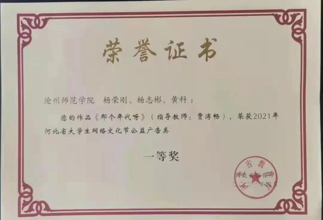 在2021年河北省大学生网络文化节中,在齐越传媒学院老师贾溥畅的指导下,杨荣刚、杨志彬、黄科拍摄制作的微电影广告《那个年代呀》荣获公益广告类一等奖。