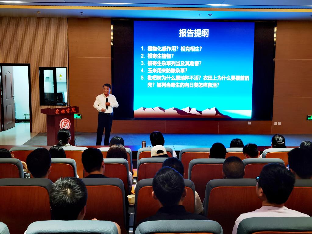 马永清教授结合自身丰富的科研经历,通过详实生动的图片、文献及案例,围绕化感作用的发现及在国内外的发展历程、植物次生代谢产物的应用、独脚金内酯的发现与利用、列当的危害与防除等问题,详细阐述了植物化感作用及其应用的相关科学知识。为现场师生呈现了一场生动精彩的学术盛宴,鼓舞了与会师生积极参与科学研究的热情。