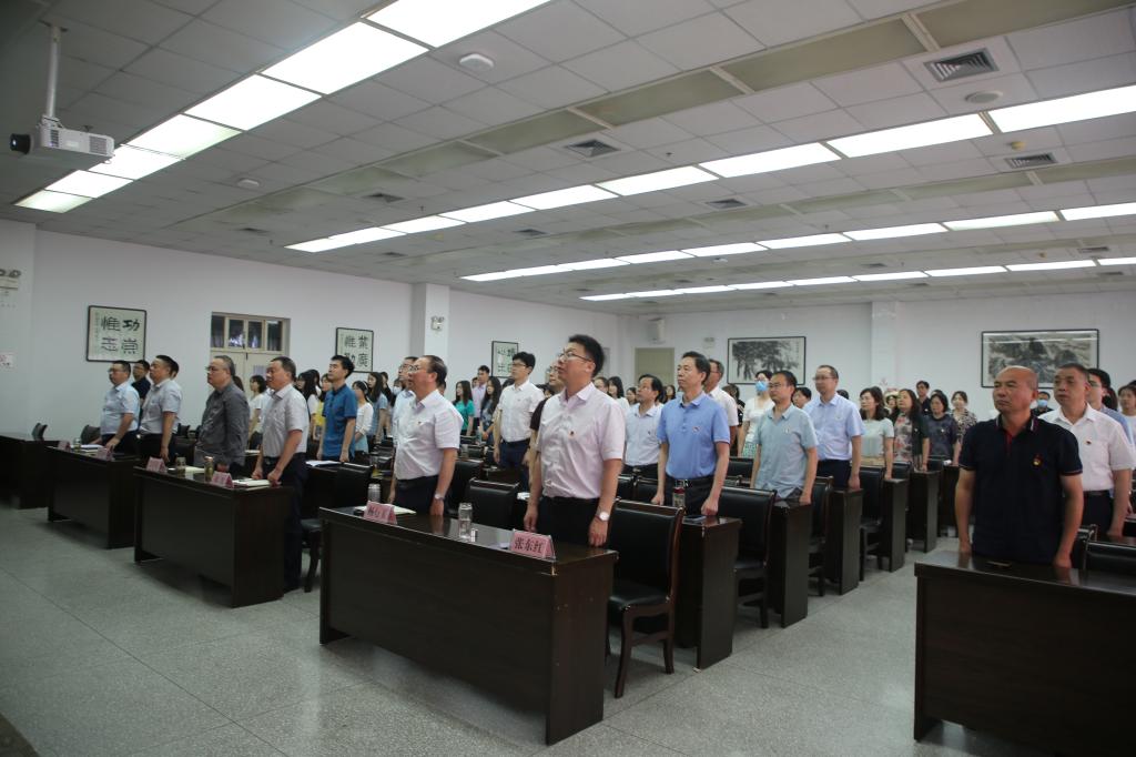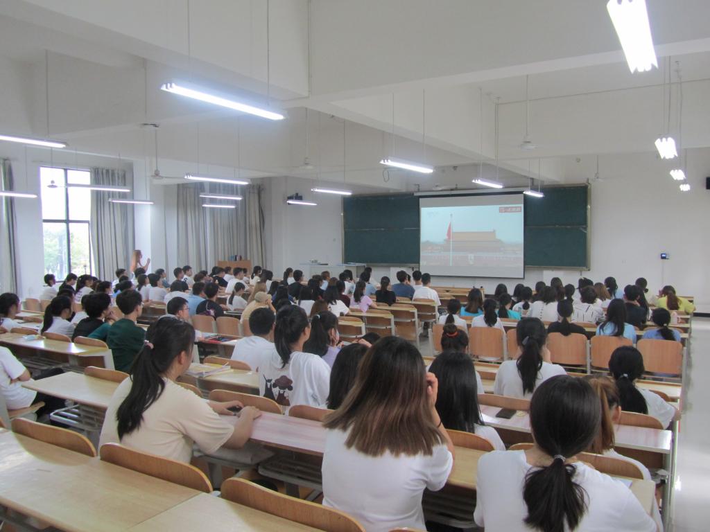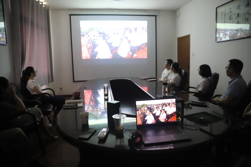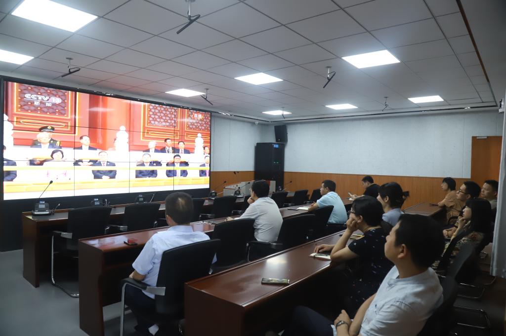 上午八点,在江南校区图书馆六楼报告厅内,学校领导、部分二级学院及职能部门负责人、学生代表等100余人集中观看网络直播。伴随着庄严肃穆的国歌声,现场人员全体起立,向着大屏幕里升起的五星红旗行注目礼。