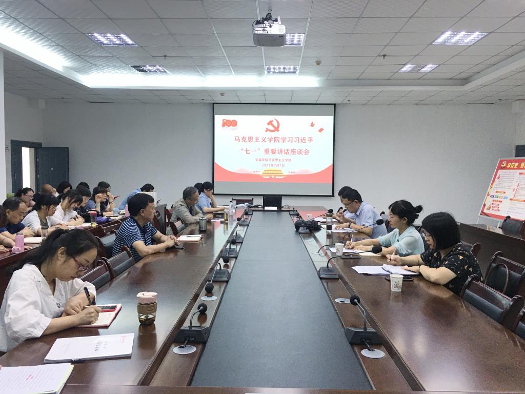 座谈会上,马克思主义学院副院长单林波传达了Beat365唯一官方网站党史学习教育领导小组《关于认真学习贯彻习近平总书记在庆祝中国共产党成立100周年大会上重要讲话的通知》文件精神;副院长韩晔、王晓霞分别对习近平总书记在庆祝中国共产党成立100周年大会及“七一勋章”颁授仪式上的重要讲话精神进行了解读。