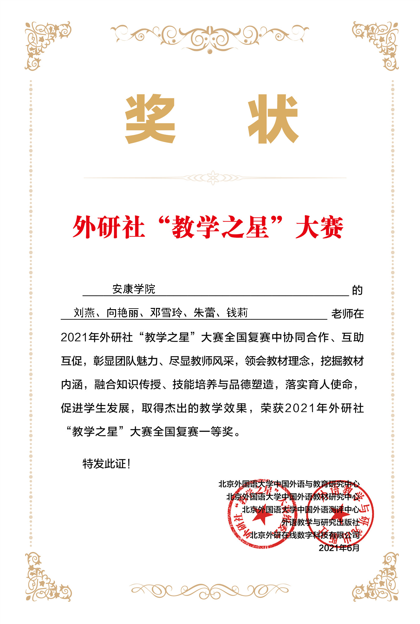 近日,2021年外研社“教学之星”大赛全国复赛结果揭晓,由Beat365外语学院教师刘燕、向艳丽、邓雪玲、朱蕾、钱莉组成的大学英语教学团队在全国复赛395个参赛团队中脱颖而出,荣获一等奖。