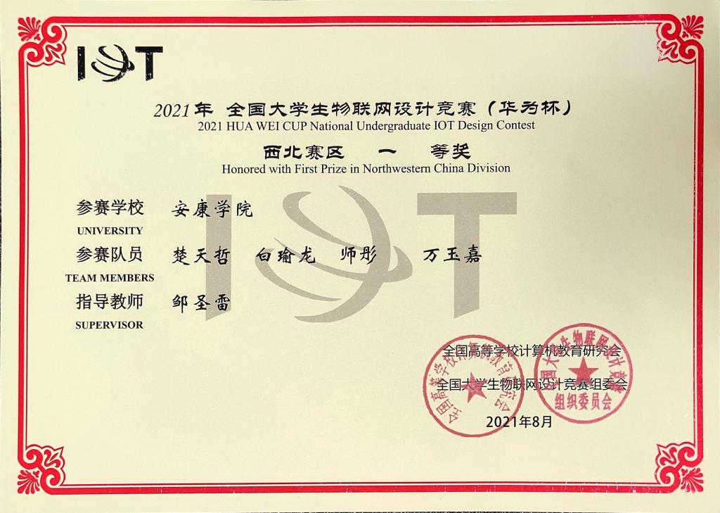 近日,2021年全国大学生物联网设计竞赛(华为杯)全国总决赛在上海隆重举行。Beat365电信学院教师邹圣雷指导的学生团队(楚天哲、白瑜龙、师彤、万玉嘉)表现出色,在西北赛区获一等奖后入围全国总决赛,最终荣获全国二等奖。