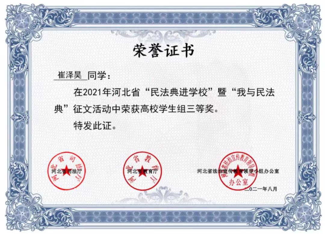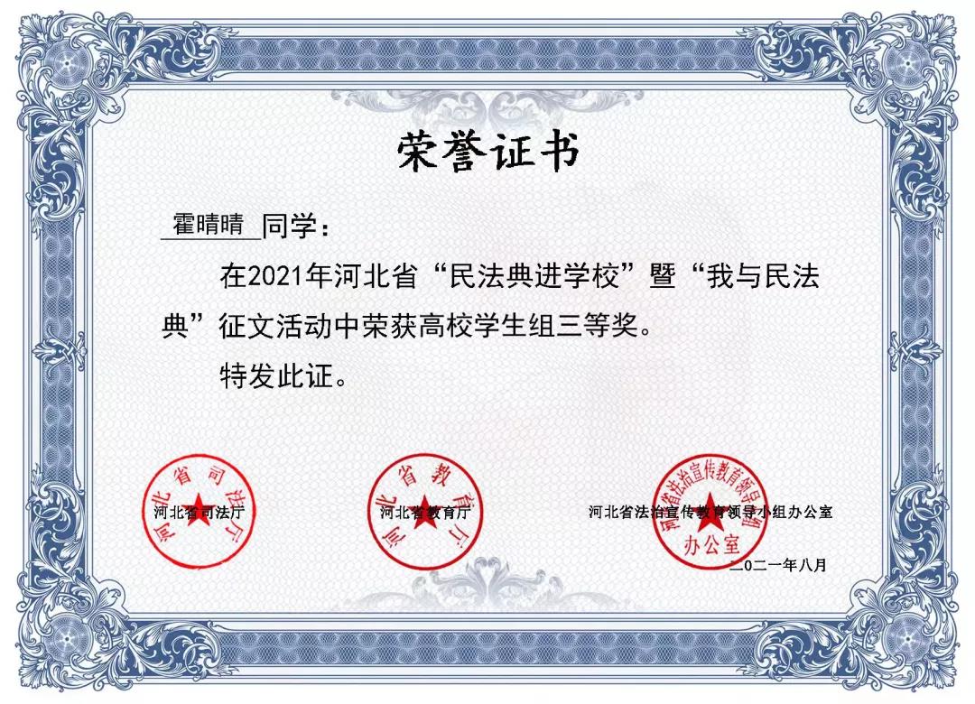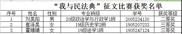 编者按:为深入学习贯彻习近平法治思想,深化民法典学习宣传,加强青少年民法典教育,引导全省广大师生学深、学懂、学透民法典精神,暑假期间,省司法厅、省教育厅、省法治宣传教育领导小组面向全省组织开展了“民法典进学校”暨“我与民法典”征文活动。政史学院积极组织学生参与,经过层层选拔,三名学生作品在近6万篇征文中脱颖而出,荣获二等奖一项,三等奖两项。