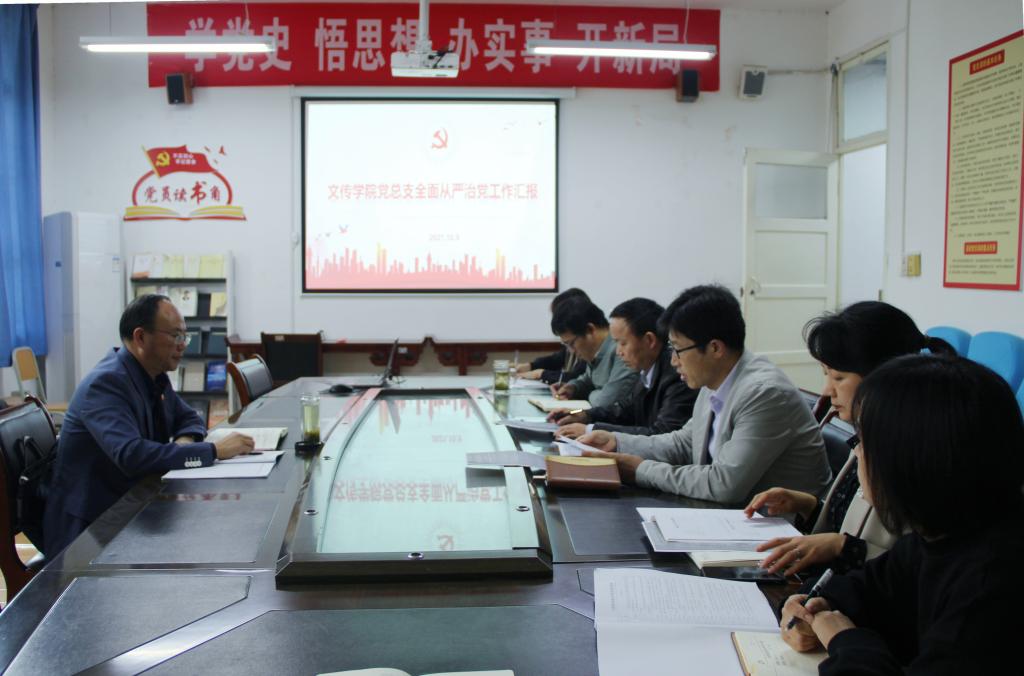 文传学院党总支书记芦伟围绕二级单位全面从严治党主体责任清单,从“明确工作任务”“强化宣传教育”“加强作风建设”“协助纪委查信办案”“推进廉政风险防控”“及时报告工作情况”“严格廉洁自律”七个方面汇报了文传学院全面从严治党工作的落实情况,同时汇报了自查存在的主要问题以及下一步全面从严治党工作的主要思路和主要措施。