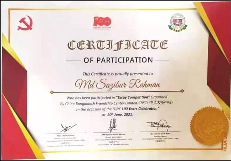 此次比赛面向孟加拉国各界人士,特别是在中国学习或工作过的人士,旨在通过他们的作品展现孟加拉人民眼中的中国共产党,分享其对中国发展的评价和感受,以此庆祝中国共产党百年华诞。获奖同学MD SAZIBUR RAHMAN在作品中讲到:“China tops the list in terms of foreign exchange reserves. As the world's largest producer, China is considered to be the world's factory for various products. Also, the fast-growing economy of the last 30 years has brought China to a unique place.”