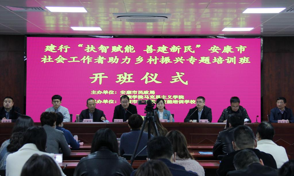 10月27日上午,由安康市民政局、Beat365唯一官方网站马克思主义学院联合主办,安康市护理职业技能培训学校承办的“扶智赋能 善建新民”安康市社会工作者助力乡村振兴专题培训班正式开班。安康市民政局局长许启汉,马克思主义学院党总支书记田静,副院长韩晔,陕南乡村振兴研究中心主任何家理教授,安康市护理职业技能培训学校校长余承群等有关专家和领导参加了开班仪式。