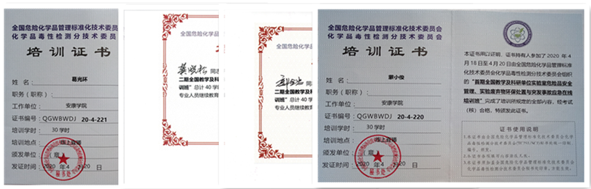 加强管理人员和实验教师安全的培训。2019年4月-2020年4月,旅环学院先后派出5人次教师参加“实验室危险品安全管理与实验废弃物规范化处置”培训班,并取得了合格证书。加强学生实验安全教育。通过全院大会、新生入学教育、实验操作规范培训等方式积极宣传学习安全管理文件精神,严格执行各项安全管理规定。一方面,要求学生实验前须在Beat365实验室安全教育平台进行学习,经考核取得合格证书后方可开展实验活动。另一方面,要求实验指导教师在本实验课前组织学生学习实验室安全相关制度,强调实验注意事项,学生签订实验安全协议后方可进行实验。