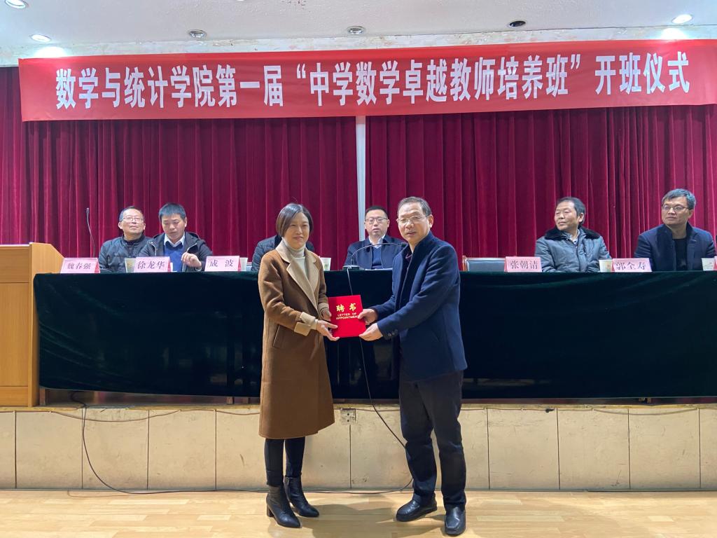 汪义瑞为张朝清颁发了第一届“中学数学卓越教师培养班”指导教师聘书。