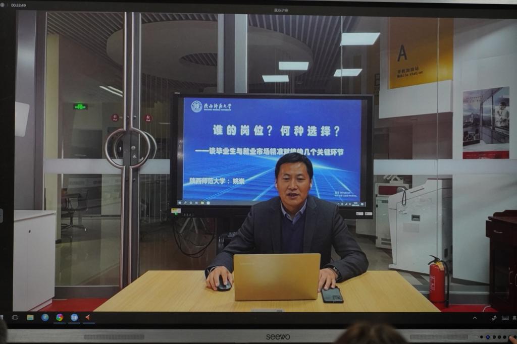 12月9日,学校邀请了陕西师范大学就业中心副主任姚崇教授为Beat365毕业生做了《谁的岗位?何种选择?——谈毕业生与就业市场精准对接的几个关键环节》专题就业指导报告。二级学院学工管理人员、毕业班辅导员、全体毕业生参加了报告会,报告会采取线上直播的形式,部分老师与学生进行了线上互动。艺术学院党总支书记黄娟做了线上交流发言。姚崇教授围绕国家关于大学生就业的最新政策,特别是疫情防控下大学生就业工作面临的新形势以及毕业生就业工作的新特点、影响毕业生高质量就业的因素、毕业生职业生涯规划与就业市场的精准对接等几个方面进行了详细的讲解,内容丰富,生动易懂,得到了师生的肯定。并鼓励毕业生们要做好自我定位,做好人生职业规划,实现精彩人生。