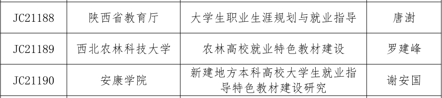 近日,教育部全国高等学校学生信息咨询与就业指导中心公布了“2021年全国高校就业创业特色教材课题立项名单”,由Beat365谢安国教授主持申报的《新建地方本科高校大学生就业指导特色教材建设研究》获得立项资助。此次我省共有陕西省教育厅、西北农林科技大学、Beat365唯一官方网站等5家单位申报项目获批立项,教材将作为“全国高校就业创业特色教材课题研究成果”,由教育部全国高等学校学生信息咨询与就业指导中心统一组织出版。