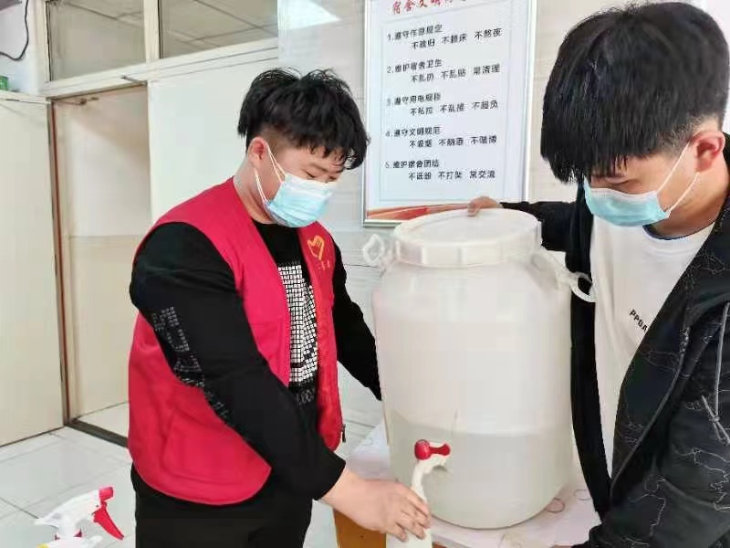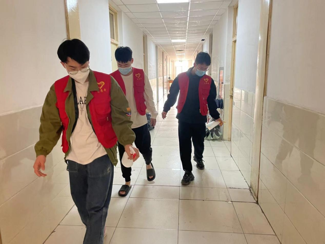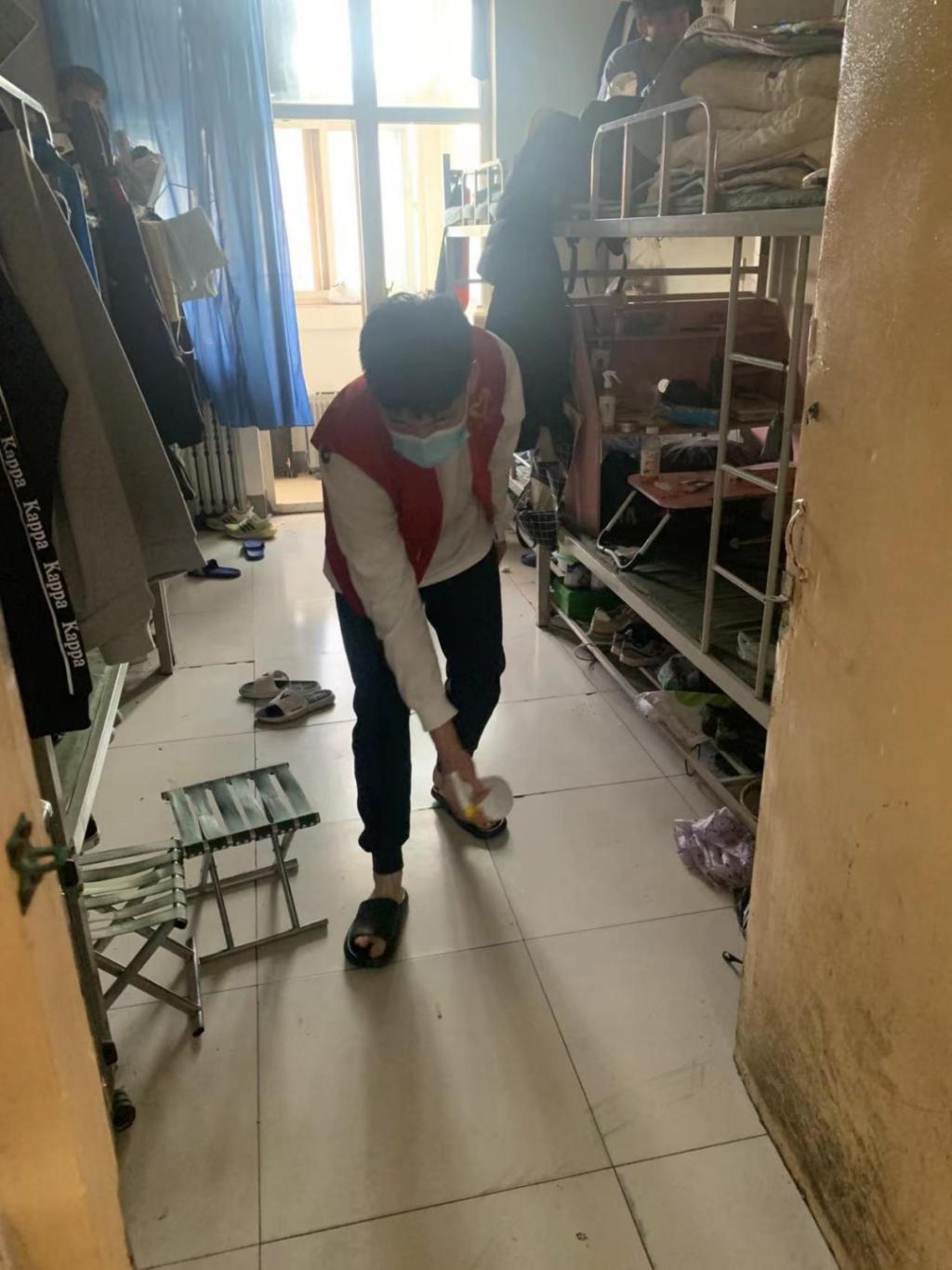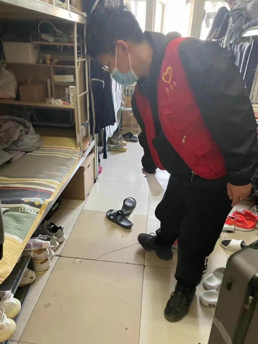 志愿者们严格按照疫情防控消杀标准进行规范消毒。对一号楼全楼楼道、水房以及4、5、6层每个宿舍的床面、床底、门角、阳台等进行多角度、全方位消毒。楼梯扶手、水房水龙头、宿舍门把手等经常接触的地方也不放过,大范围喷洒消毒液进行消杀,确保做到不留死角、不留盲区,筑牢抗疫安全防线。同时消杀过程中,志愿者们也暖心提醒同学们一定多通风,按时清理宿舍垃圾,避免细菌滋生。