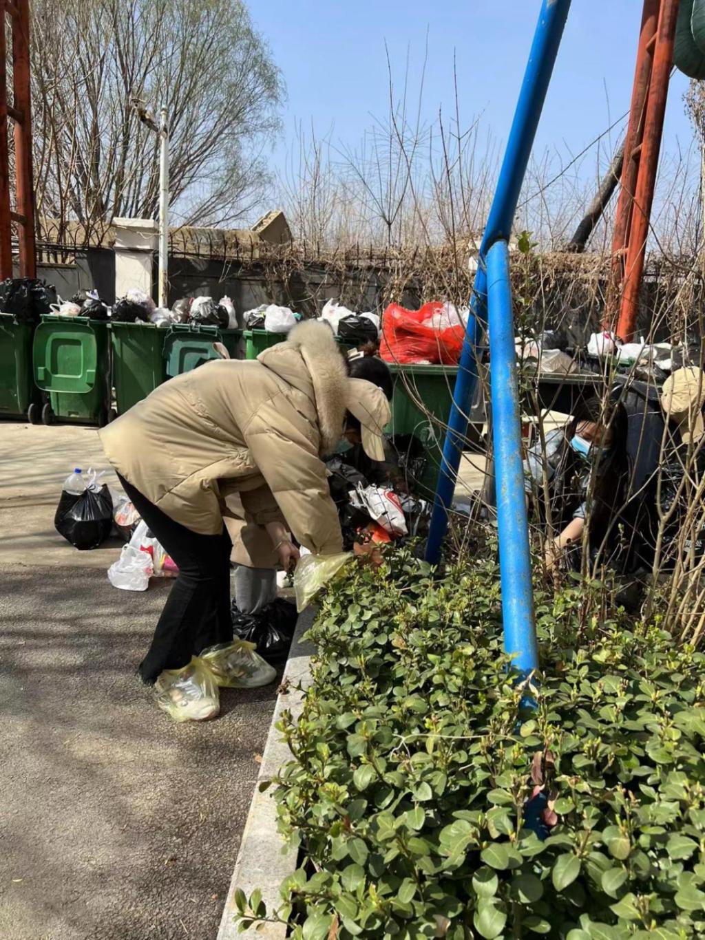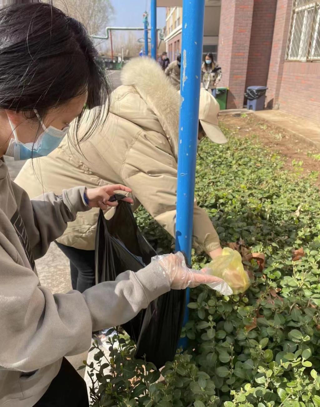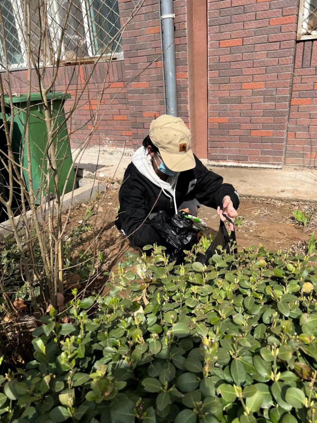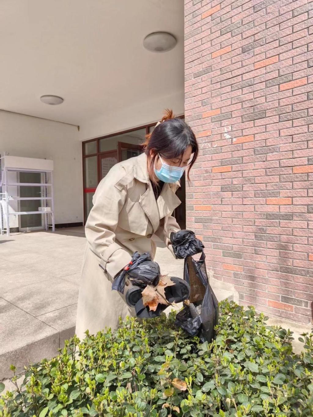 还有部分志愿者在五号楼楼外,帮助太阳集团保洁人员进行卫生清洁工作,捡拾白色垃圾,将垃圾统一放置,为太阳集团防疫工作减轻部分压力,奉献自己的一份力量。