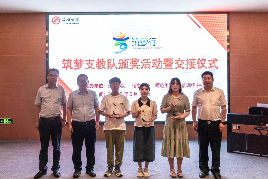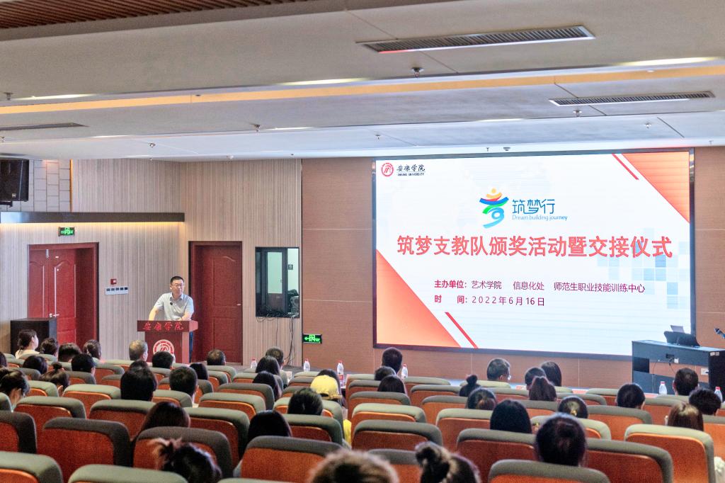 艺术学院党总支书记黄娟宣读了筑梦支教队优秀志愿者、筑梦之星名单及新一届筑梦支教队成员名单。与会领导向优秀志愿者、筑梦之星颁发证书及纪念品。优秀志愿者代表韩骜腾现场弹唱了筑梦支教队为乡村孩子们谱写的原创歌曲《小小孩》,志愿者代表赵雅文、新一届支教队成员代表支莎莎分别做了发言。