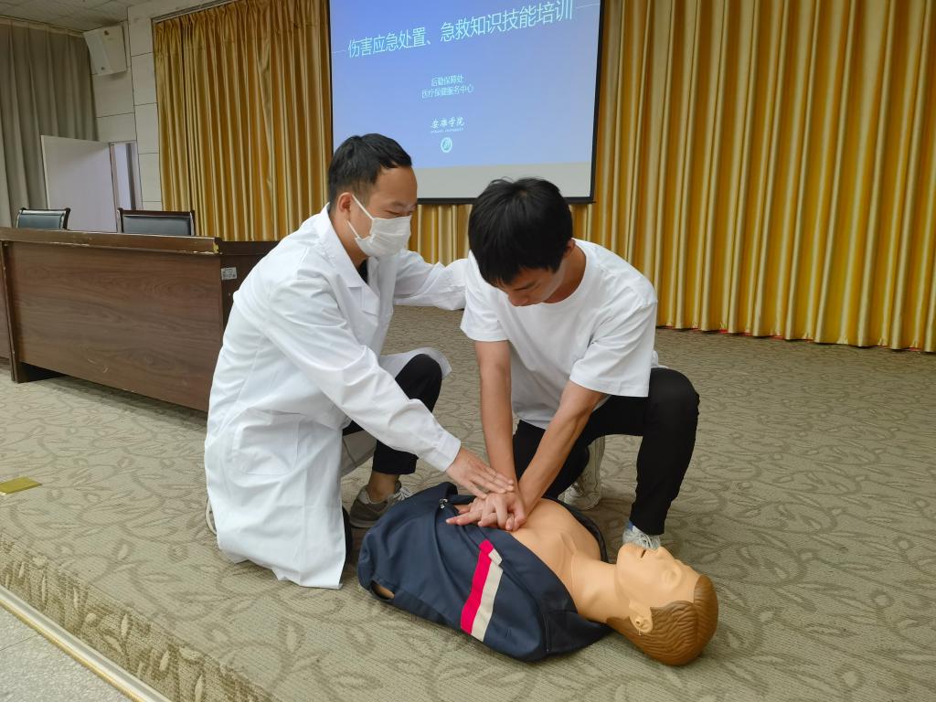 医疗保健服务中心医师梁汝江介绍了中暑、溺水、烧烫伤、成人徒手心肺复苏、海姆立克急救法、止血、包扎、骨折固定等各种常见的紧急情况急救措施和注意事项,并通过视频和现场演示,展示了各类包扎法的具体操作步骤以及挫伤、扭伤、擦伤和烧烫伤等方面的急救措施,向现场师生演示了自救方法和技巧;对参加培训的师生进行了现场心肺复苏完整流程的实操培训,并对按压动作、力度、频率、注意事项等细节逐一讲解和示范。