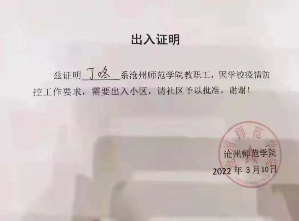 疫情突袭沧州,全市被封控。在3月9日收到校外教职工不能返校的消息后,丁咚老师第一时间想到了自己的学生,他召开紧急视频会议,及时安抚学生情绪,并叮嘱学生要严格遵守疫情防控各项规定。因学校疫情防控工作需要,急需校外教职工返校工作,3月10日,丁咚老师持学校开具的出入证明,立即返回学校,决心冲在一线,全力以赴打好疫情防控阻击战。