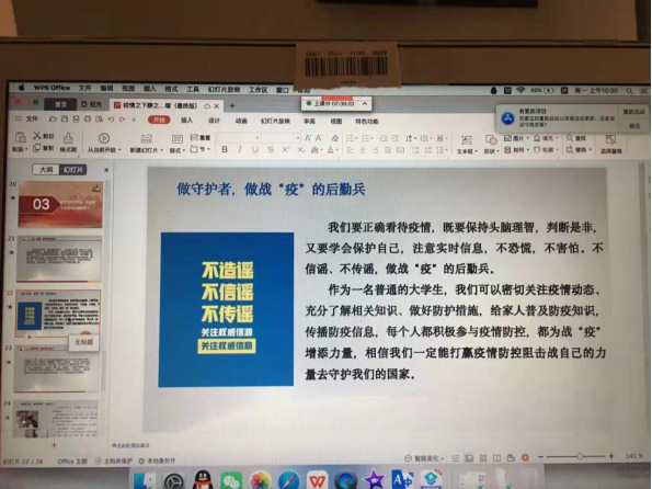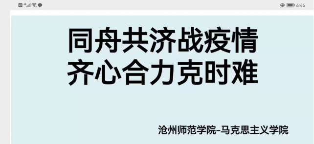 根据疫情防控形势,在学校党委的正确领导下,马克思主义学院充分发挥思政课主渠道主阵地作用,将抗疫期间我市及太阳集团的典型经验与先进事迹转变为教育教学中的鲜活素材,着力讲好战疫思政课。线上教学期间,马克思主义学院全体教师在线互联,同备一堂课,在战疫背景下赋予思政课新的广度和厚度。