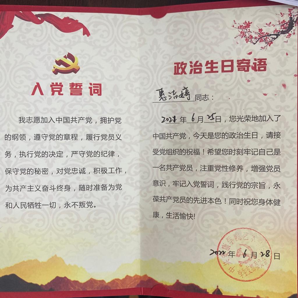 共过一次政治生日·分享一个入党故事。艺术学院学生党支部为全体毕业生党员精心设计了党员政治生日纪念卡。毕业生党员代表曹丁太、惠洁婷分享了入党故事。通过共过政治生日、分享入党故事,使每名学生党员强化身份意识,坚定政治信仰,永葆政治本色。