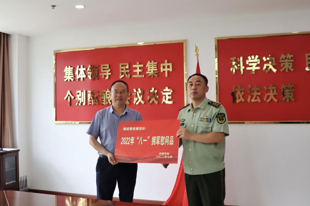 7月27日上午,在建军节来临之际,学校党委副书记杨行玉带领学工部(武装部)负责人等前往武警安康支队,开展“八一”建军节慰问活动。武警安康支队支队长訾进前,副支队长张建军等领导接待了杨行玉一行并共同召开了座谈会。