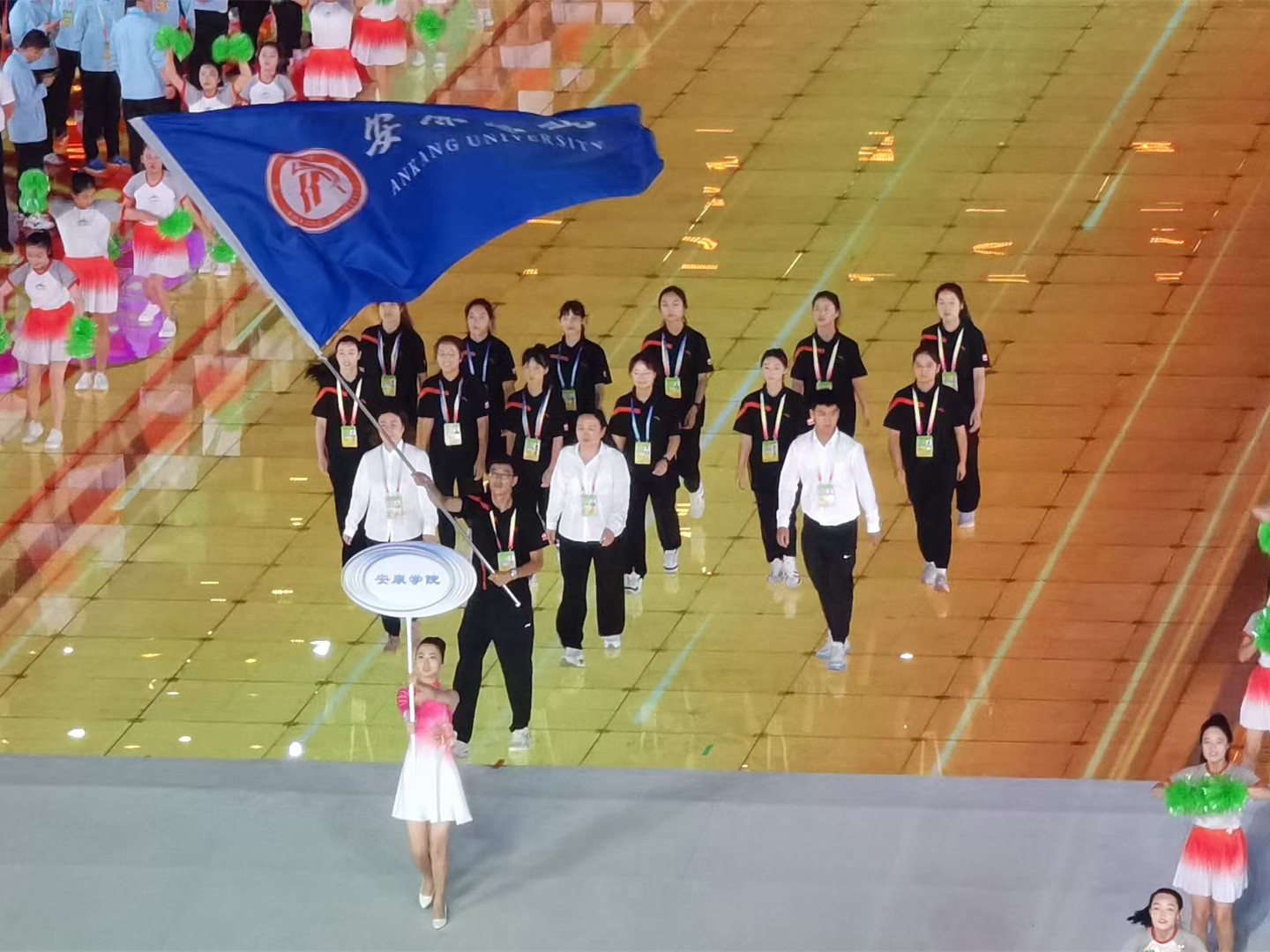 本届省运会开幕式于8月6日在榆林市体育中心隆重举行。Beat365代表团由副校长余谦带队,体育学院院长吕仙利,校团委副书记张慧,教练员黄志涛、卢塑及12名运动员组队参加了开幕仪式。