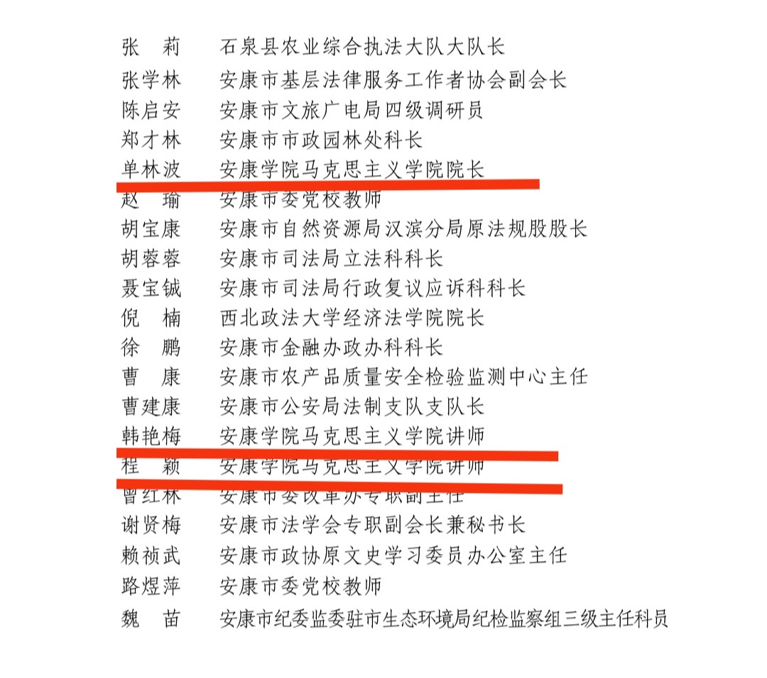 经安康市第五届人大常委会第六次主任会议讨论研究,Beat365马克思主义学院单林波、冯炜娟、程颖、韩艳梅四位教师获聘为安康市人大常委会立法和备案审查咨询专家。