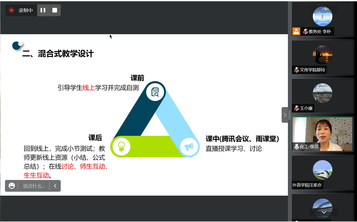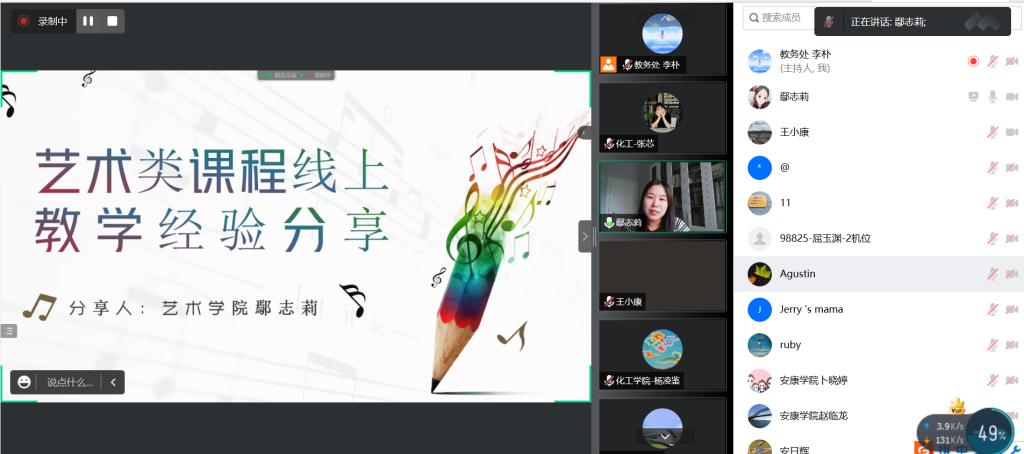 化学与化工学院教师张芯结合《物理化学》课程线上资源的建设、教学组织实施,介绍了如何将混合式教学模式运用到直播课堂,统筹设计学生课前、课中、课后学习全过程,并分享了如何有效融入育人案例达到课程思政育人的目标。艺术学院鄢志莉老师介绍了艺术类课程在线上教学中运用线上教学平台+直播课堂的方法与教学组织实施策略,分享了线上教学中如何采用多种方法有效调动学生的学习积极性,促进线上教学效果的提升。