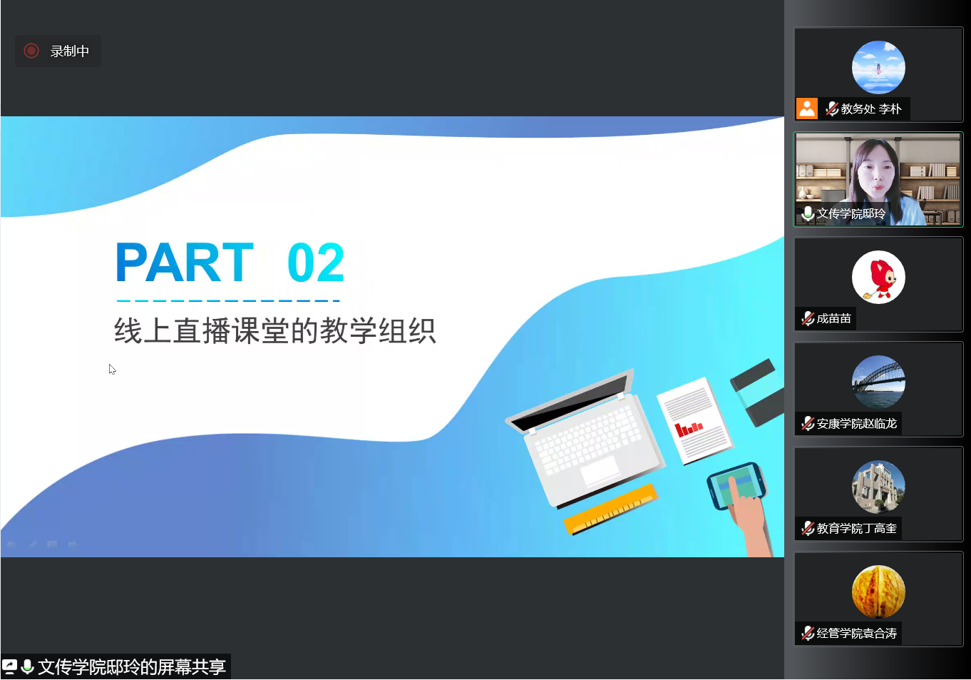 活动中,文学与传媒学院教师邸玲以“基于多平台模式的线上教学经验交流”为主题,从线上教学平台的选择、功能应用、教学设计、教学效果与反思等方面与大家交流了自己的经验与做法,并针对线上直播课堂存在的教学监管难度大、课堂互动氛围不足、教学进度滞后、学生易走神疲倦等问题分享了自己行之有效的应对策略。